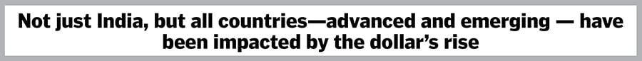 Not just India but all countries, advanced and emerging, have been impacted by the dollar’s rise. India, in fact, has been a relative outperformer. The rupee has weakened by around 10 percent against the greenback since the start of the year, compared to other currencies such as the British pound, the euro, the Japanese yen and the Chinese yuan, which all slid by 15-20 percent.
