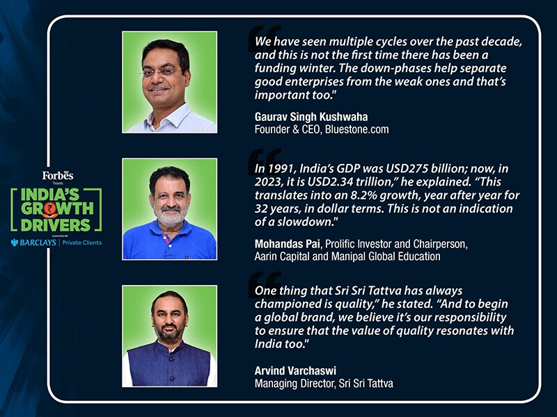 Mohandas Pai is a prolific investor, and the Chairman of Aarin Capital and Manipal Global Education, making him well-qualified to comment on current conditions: “In 1991, India’s GDP was USD275 billion; now, in 2023, it is USD2.34 trillion,” he explained. “This translates into an 8.2% growth, year after year for 32 years, in dollar terms. This is not an indication of a slowdown.”