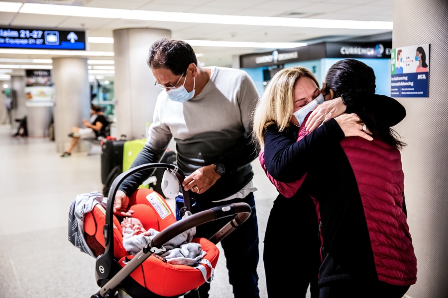 Passengers arriving from Sao Paolo, Brazil, greet their daughter, right, and three-week-old grandson, at Miami International Airport in Miami on Monday, Nov. 8, 2021. As of Monday, foreign travelers can enter the United States if they show proof of full vaccination and a negative coronavirus test taken within three days of departure. (Scott McIntyre/The New York)