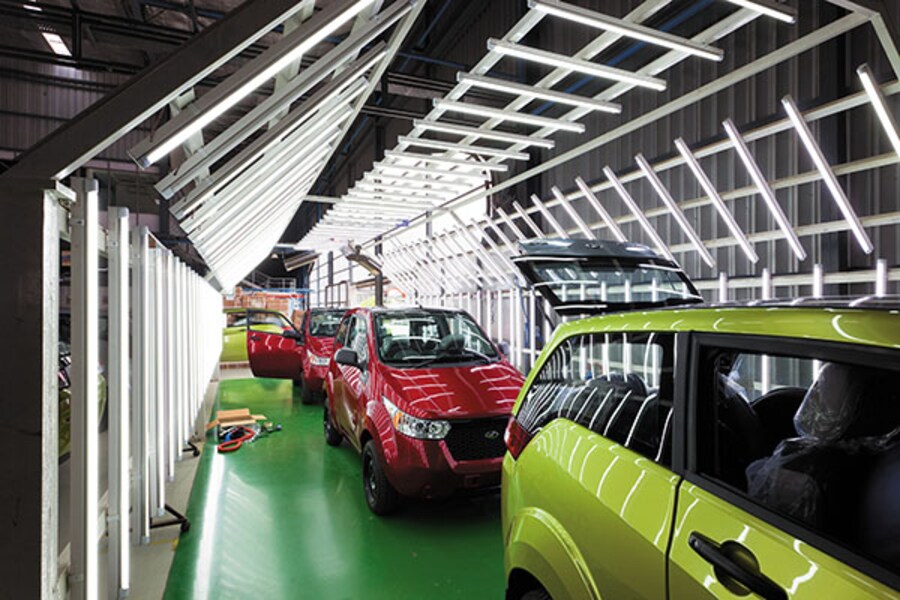 No one perspires at the mahindra reva plant. Outside, however, Bangalore—otherwise envied for its salubrious weather—is an uncomfortable 360 celsius. There are no fans running along the assembly line. There is no need. The aerodynamic structure of the car-manufacturing facility allows fresh air to flow through continuously. It is obvious at first glance. This isn’t a typical automobile plant. Unlike the usual A-framed structure supported by huge columns, the Reva facility gives the impression of a futuristic retreat. The spaceship-inspired architecture comprises triangular units, the ends of which are knotted to form an aerodynamically shaped truss that touches the least possible ground space—the entire formation is perched atop the surface without bullying the earth.
